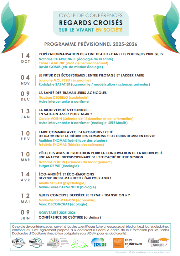 Lancé par une collaboration entre les Défis Clés BiodivOc, RIVOC, la MSH Sud, le labex Cemeb et l’Ecole doctoral ED60 de l’université Paul Valéry, ce cycle a été rejoint récemment par le Défi Clé Octaave, la MSHS-T et le PTL3 « Biodiversité, écologie et évolution » de l’Université de Montpellier pour les années 2025/2026 et 2026/2027.